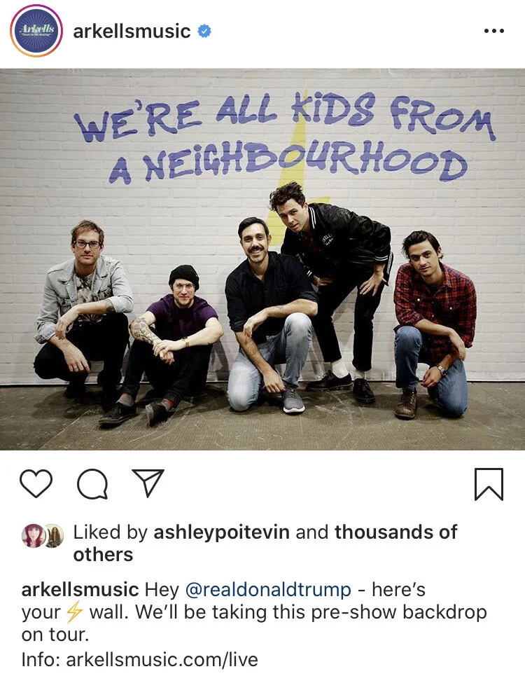 As reported by the Hamilton Spectator, the “outspoken Arkells [are] not shy about holding politicians accountable.” In addition to being a voice for the working class, holding politicians to account with hits like “People’s Champ”, alluding to Donald Trump stating “you do nothing every year but showin’ up on the red carpet” having “no vision for the long run” and “no sense of history”, one is able to identify with the Arkells politics, strengthening their engagement with the band further then their enjoyment of the song. Being political has become a part of the Arkells brand, and the best part is, it works for the common good they see for their fans. Although every band, person, or musician has a political stance, by incorporating it into your bands persona, the relationship between a fan, and lead singer Max Kerman is one bonded by shared worldviews.